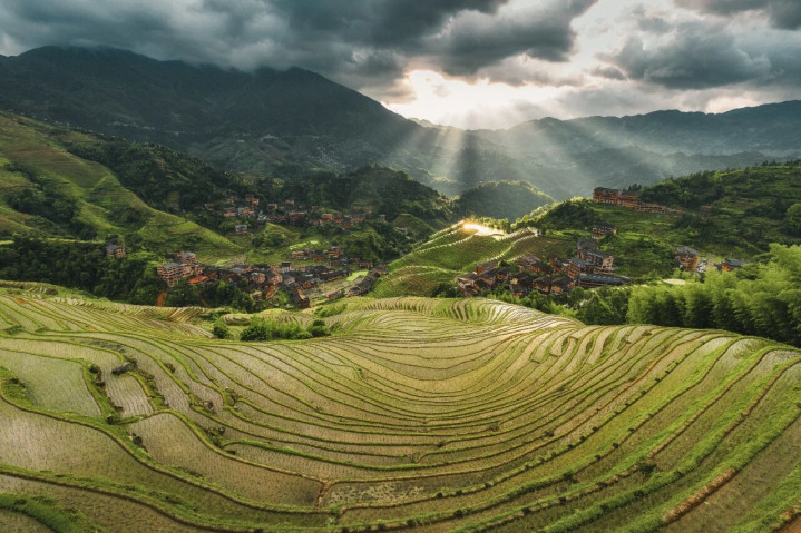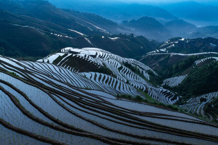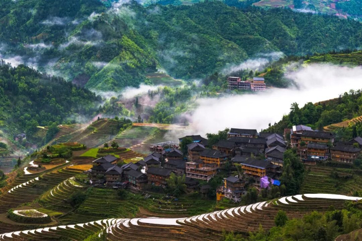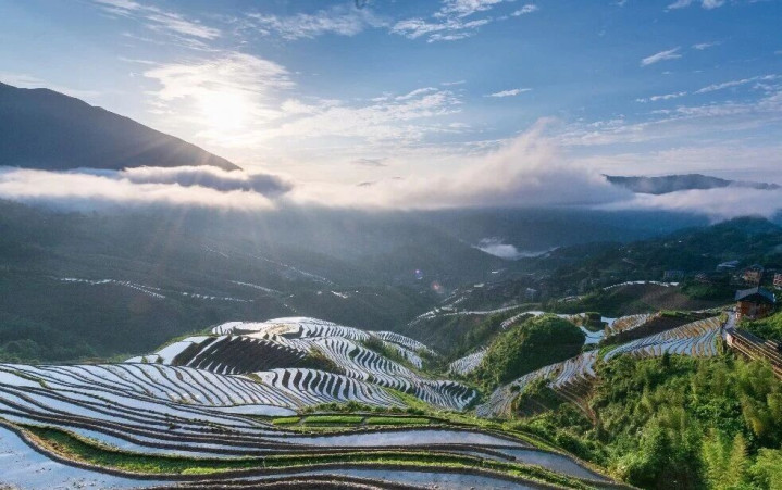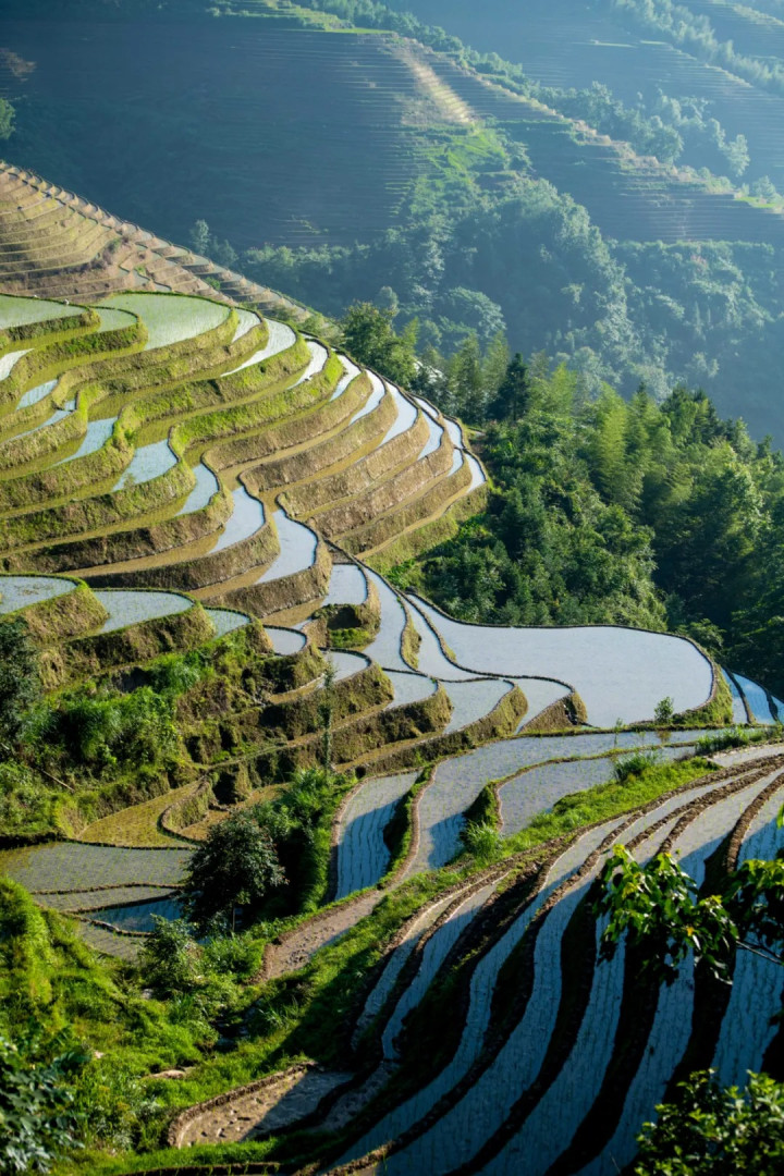 龙脊梯田:镜面里的春日序曲 春日的龙脊梯田,正处于插秧的农忙时节。亮晶晶的镜面梯田上,农民弯腰插秧,绿色的秧苗点缀水中,勾画出一幅古朴而无邪的田园欢娱。