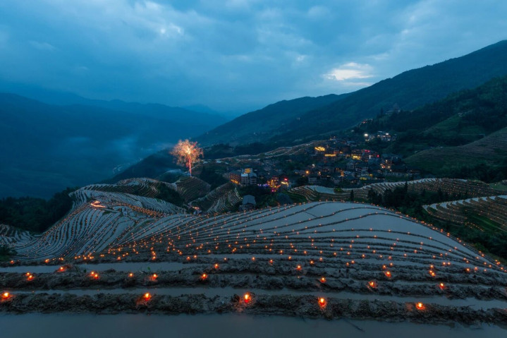 夜晚的龙脊梯田更是凝视,水田边亮起彻亮的灯光,精通在暮夜里,像是一派整皆的银河,应和着壮寨的点点灯火,充满了玄幻的漫画感。