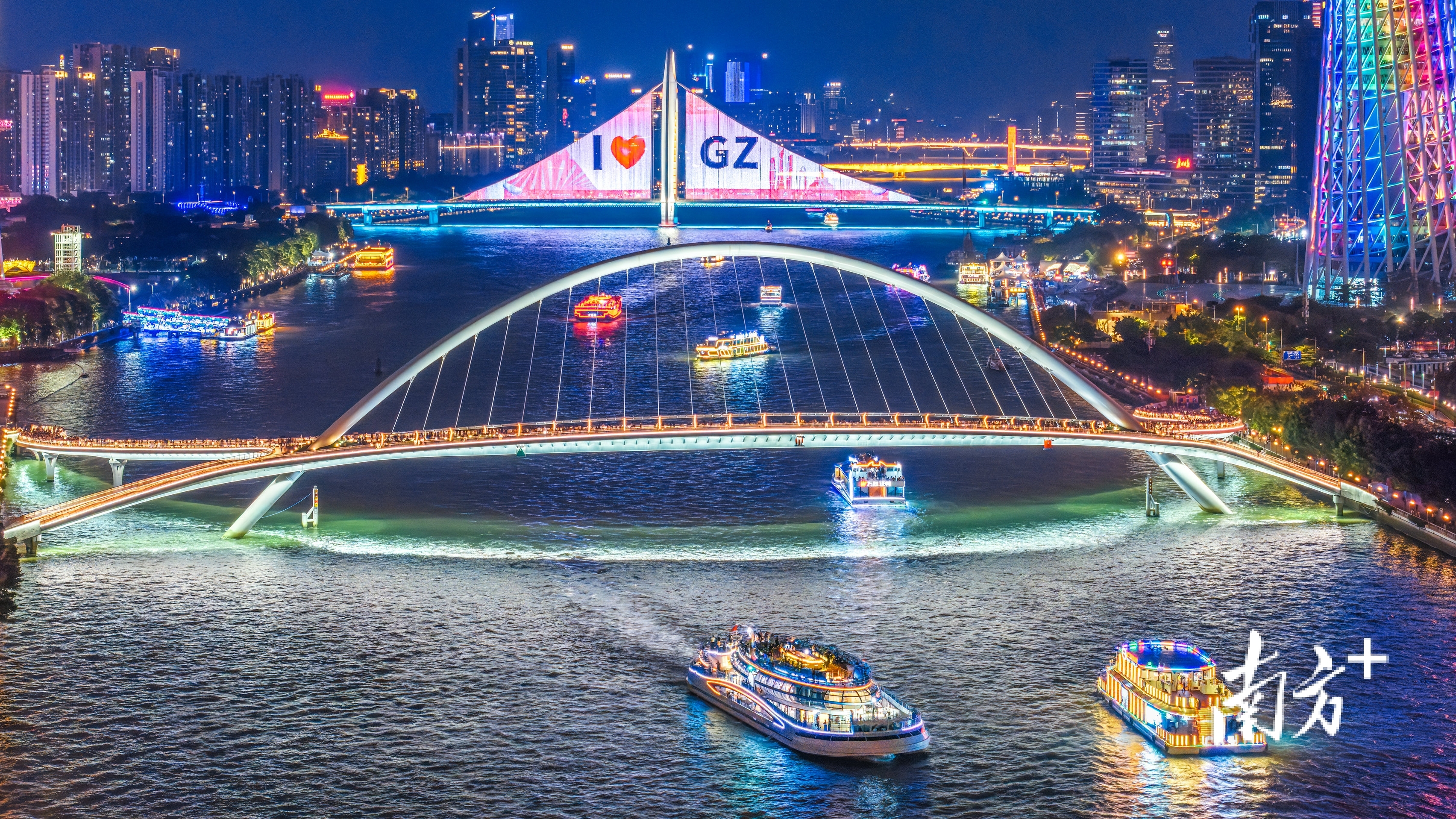 广州新中轴线夜景,海心桥谈判起花城广场和广州新地标广州塔。