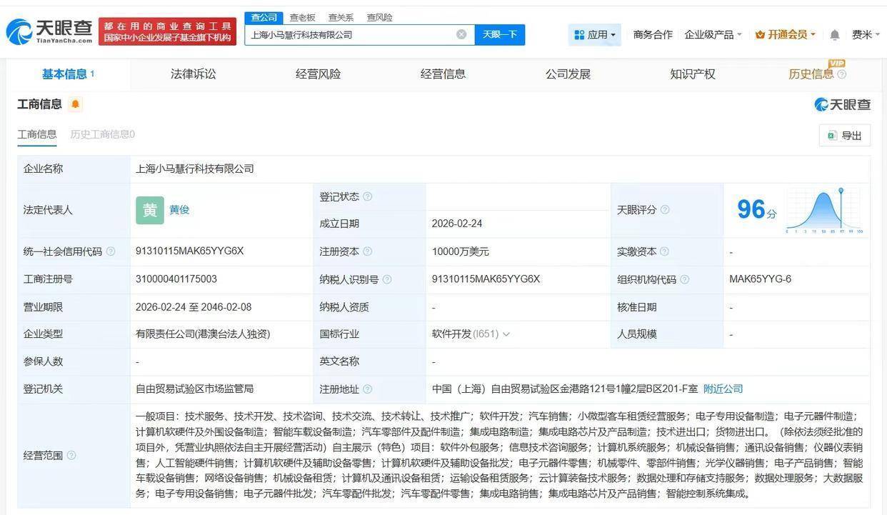 天眼查App败露,2月24日,上海小马慧行科技有限公司建树体育游戏app平台,法定代表东谈主为黄俊,注册成本1亿好意思元,观点领域包括软件开拓、汽车销售、小袖珍客车租借观点行状等,由香港小马智行有限公司全资合手股。