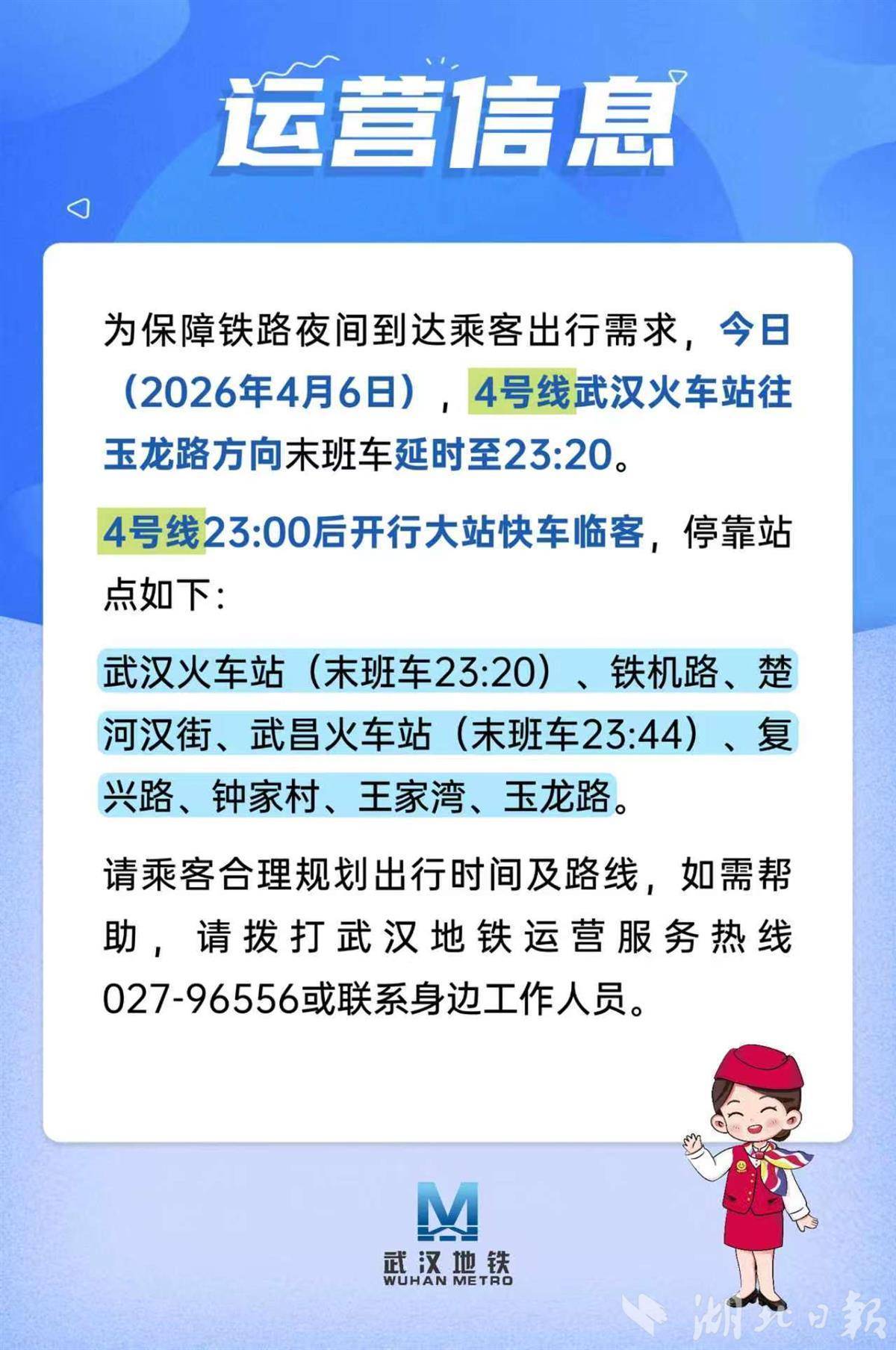为保险铁路夜间到达乘客出行需求,本日(2026年4月6日),4号线武汉火车站往玉龙路地点末班车延时至23:20。4号线:23:00后开行大站快车临客,泊岸站点如下:武汉火车站(末班车23:20)、铁机路、楚天河街、武昌火车站(末班车23:44)、回复路、钟家村、王家湾、玉龙路。