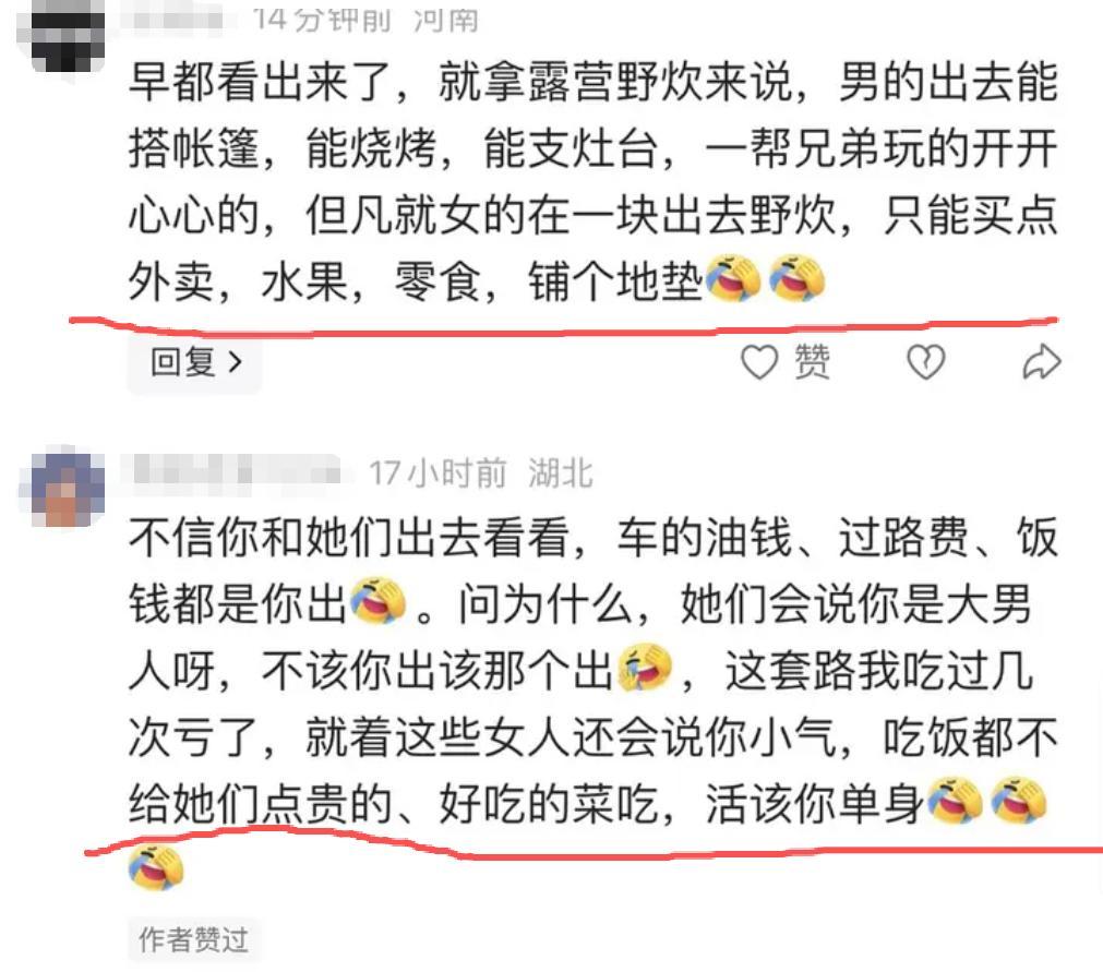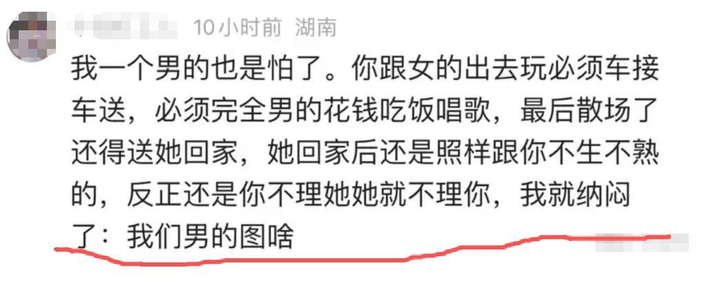 是以你看到的不是男生变精,而是好多东说念主启动拒却无效大意,再看辩驳区,其实说得很平直。不少男生齐有访佛资格,出去玩一回,油钱、饭钱、路费全包,经过里还要顾及脸色,关注体验,临了联系也没更近,以至还被嫌这嫌那。