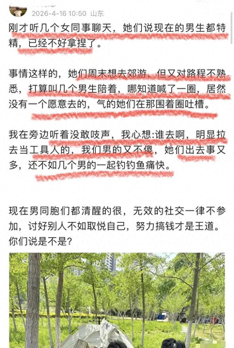 近日,山东一位网友在单元里听到几位女共事聊天。她们周末思去远足,但不认路,也没东说念主开车,就思着喊几个男共事一齐去。效力喊了一圈,没东说念主接话,也没东说念主自得去。