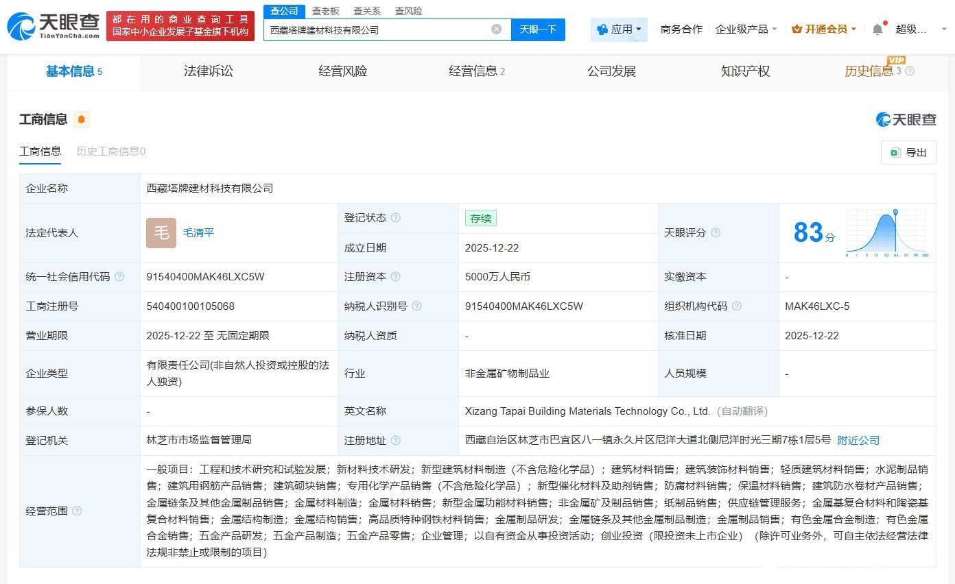 天眼查App显现开云(中国)Kaiyun·官方网站 - 登录入口,近日,西藏塔牌建材科技有限公司建树,法定代表东谈主为毛清平,注册成本5000万东谈主民币,探究界限包括工程和手艺商议和熟习发展、新材料手艺研发、新式建筑材料制造、新式金属功能材料销售等。鼓吹信息显现,该公司由塔牌集团(002233)全资握股。